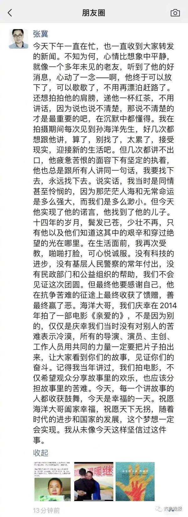 说实话,我当时是同情甚至怜悯的,因为那茫茫人海和无常命运是多么强大,而我们是多么渺小。但今天他实现了他的诺言,他找到了他的儿子。十四年的岁月,鬓发已苍,少壮不再,只有他以及他们知道这其中的艰辛和穿过绝望的光在哪里。在生活面前,我再次受教,啪啪打脸,可心悦诚服。没有科技的进步,没有基层人民警察的常年付出,没有民政部门和公益组织的帮助,我们不会见证这次团圆。但最终他要感谢自己,他在抗争苦难的征途上最终收获了馈赠,善最终赢了恶。”