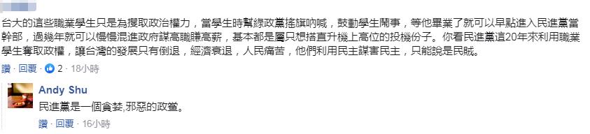 更有人批评凃峻清等“职业学生”,认为他们只是为攫取政治权力,“当学生时帮绿政党摇旗呐喊,鼓动学生闹事,等他毕业了就可以早点进入民进党当干部,过几年就可以慢慢混进政府谋高职赚高薪,基本都是属只想搭直升机上高位的投机分子。”