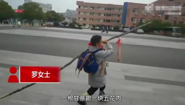 再仔细看,发现那也不是什么棍子,而是一根长长的甘蔗。家长表示之后这两个都是学生在学校表现得好,得到了三好学生的表彰,现在学校给了甘蔗和五花肉做奖励。
