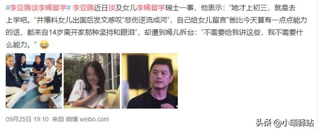 前段时间,在瑞士上学的李嫣发了一条朋友圈:悲伤逆流成河。爸爸李亚鹏回复说:“爸比今天算有一点点能力的话,都来自14岁离开家那种坚持和眼泪。“